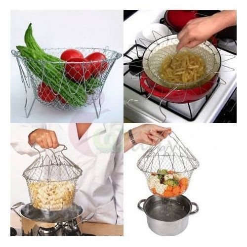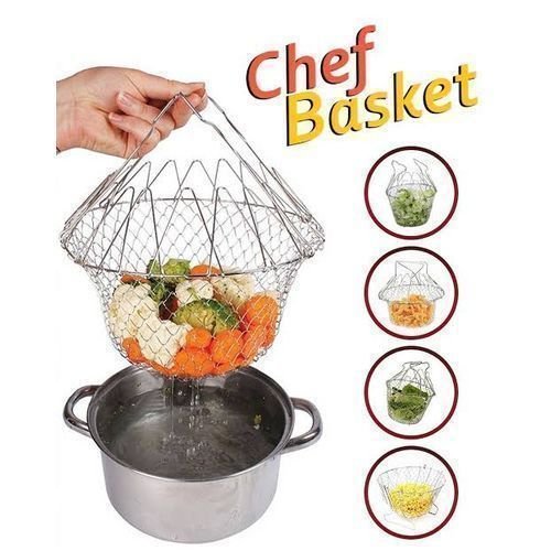 Multipurpose Foldable Chef Basket is a kitchen aid that saves you the stress of draining out hot/cold water from your cooking pot while boiling, frying or washing your food items. It serves as a why of serving your meal directly from the pot.