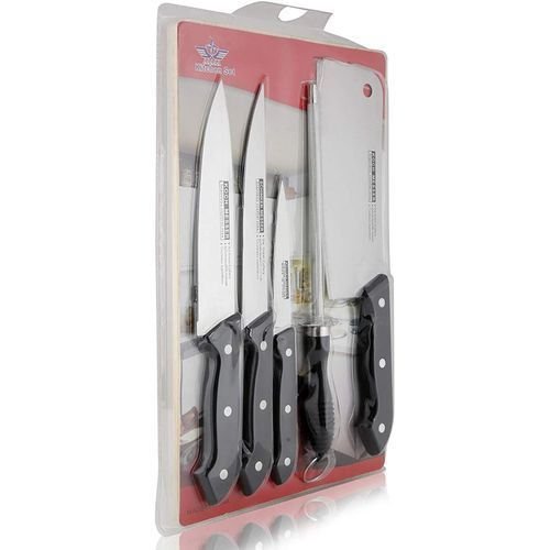 This Sets of Kitchen Knife, Sharpener and chopping board consist of different sizes of knives with different function. It consist of kitchen knives, pricing knife, scissors, mini cutlass use for cutting bony fish , chicken, turkey etc and a chopping board. It is made of metal blade and abs plastic head. It does not rust, very strong, easy to wash and store, a must have for every kitchen and a great value for money.